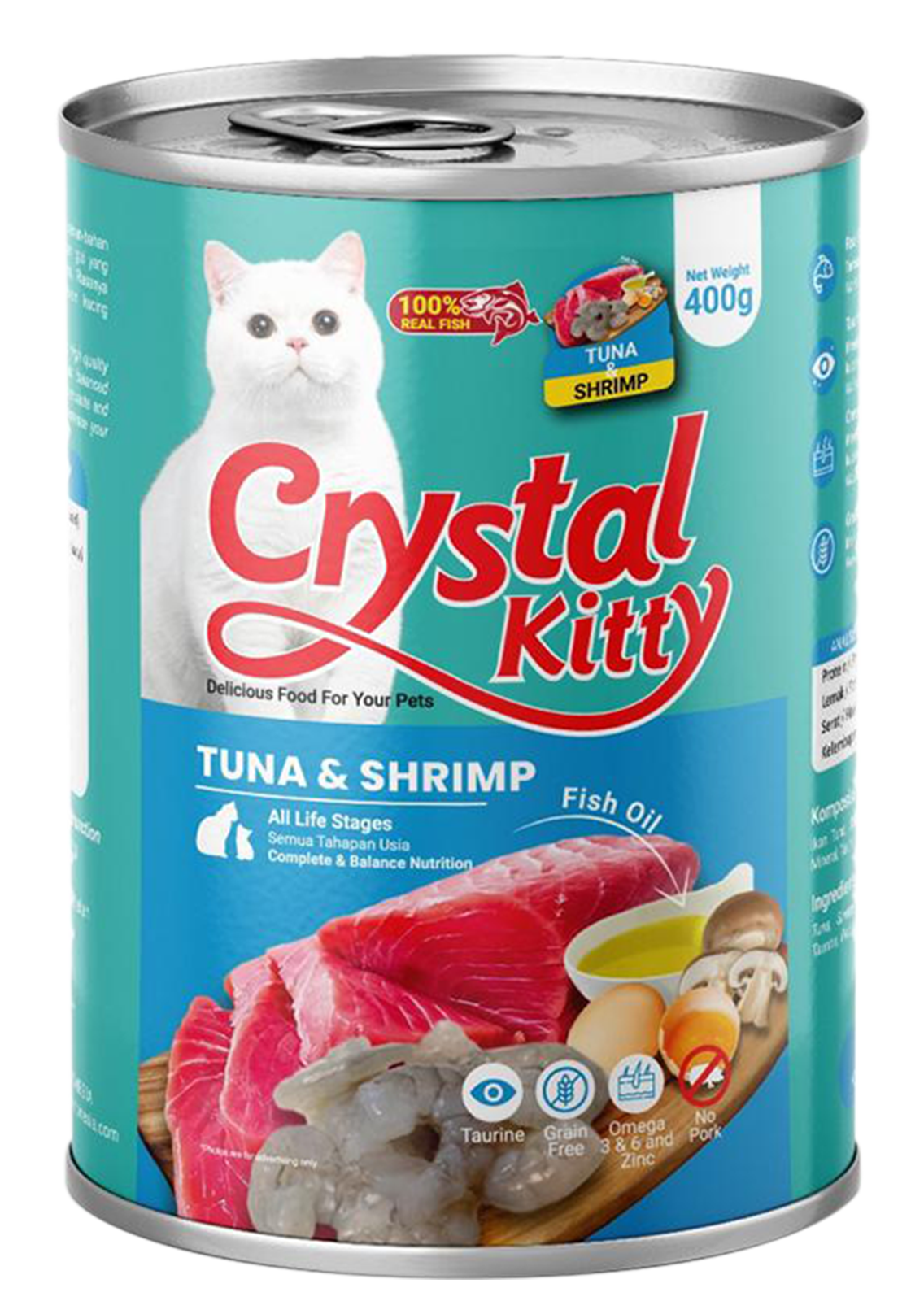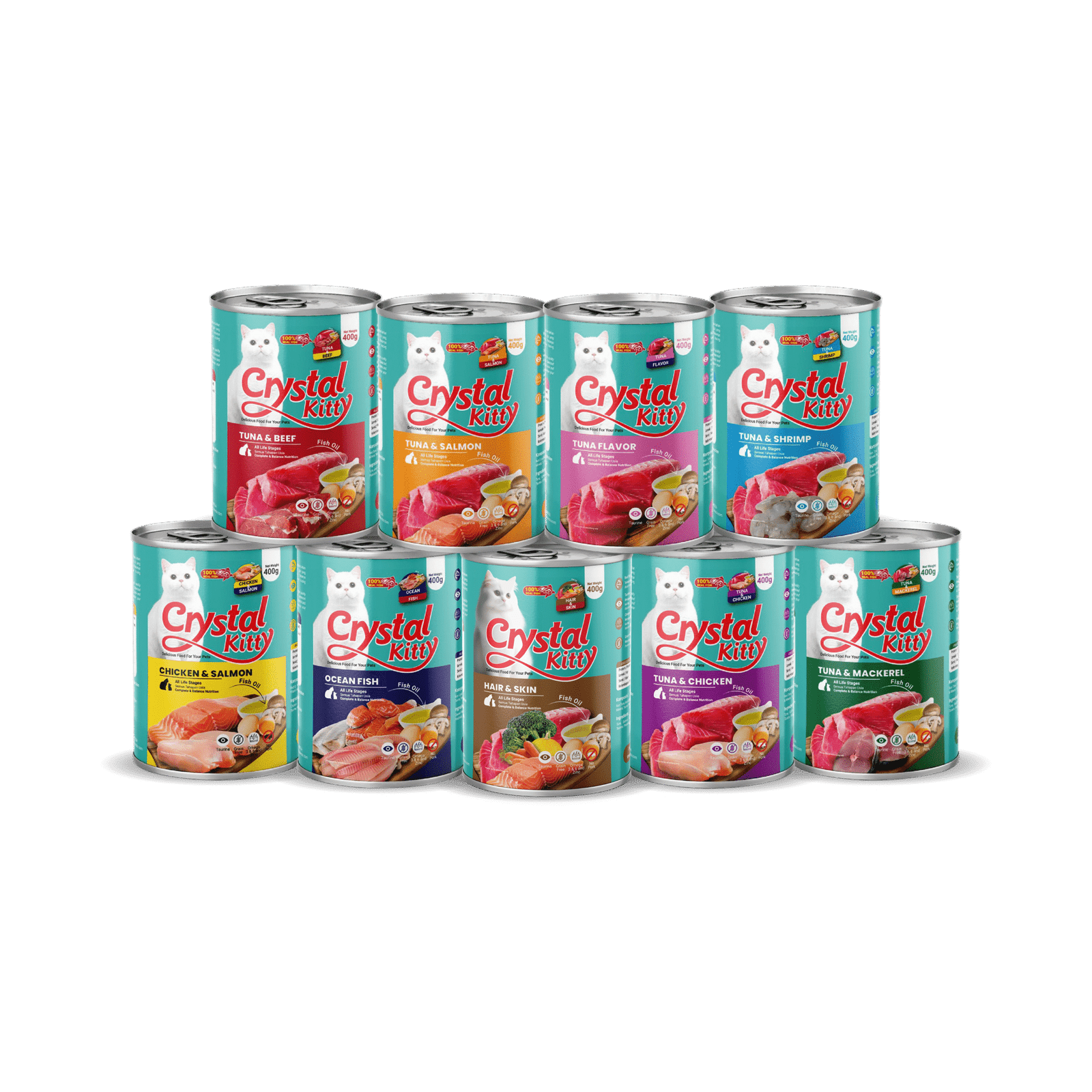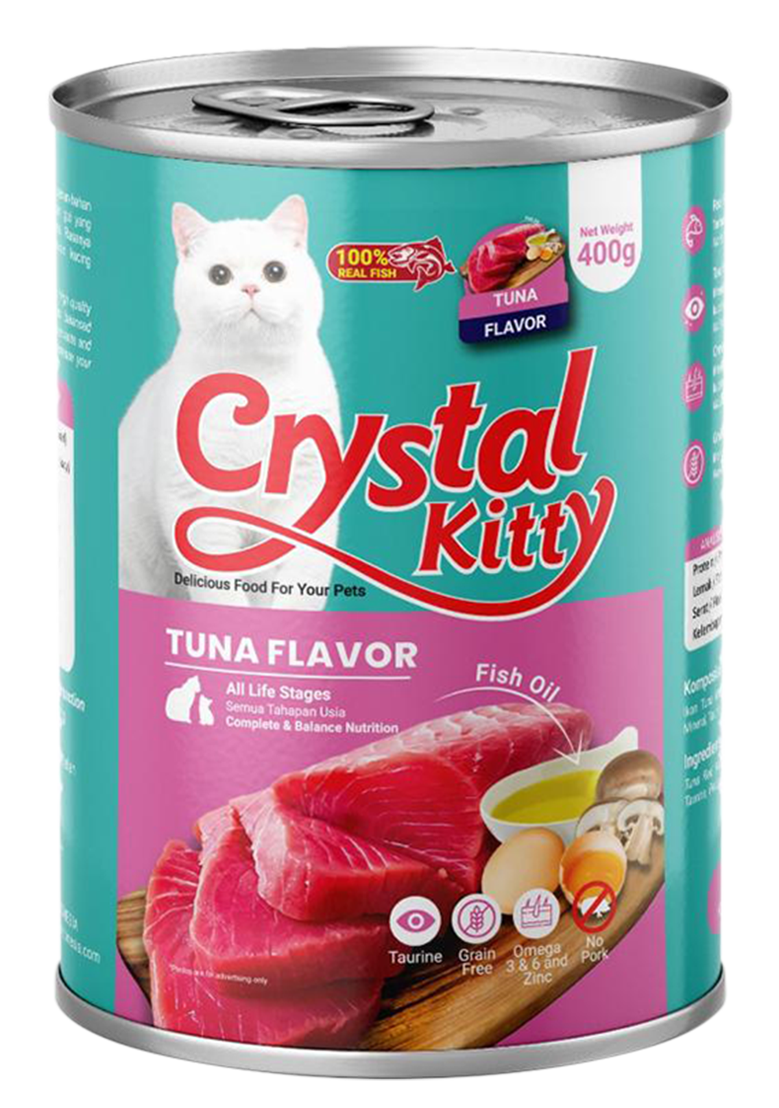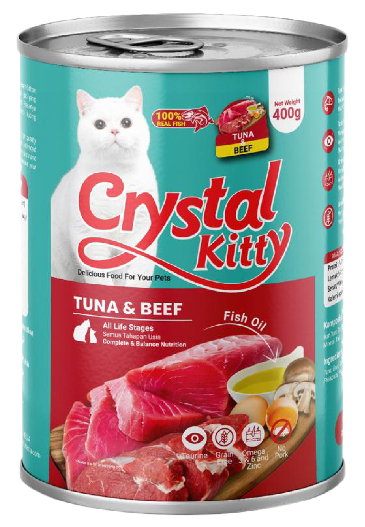 Crystal Kitty Cat Food Canned dibuat dengan bahan-bahan berkualitas tinggi dan segar, nutrisi lengkap dan gizi yang seimbang untuk memenuhi kebutuhan kucingmu. Rasanya yang lezat dapat meningkatkan nafsu makan kucing kesayanganmu
