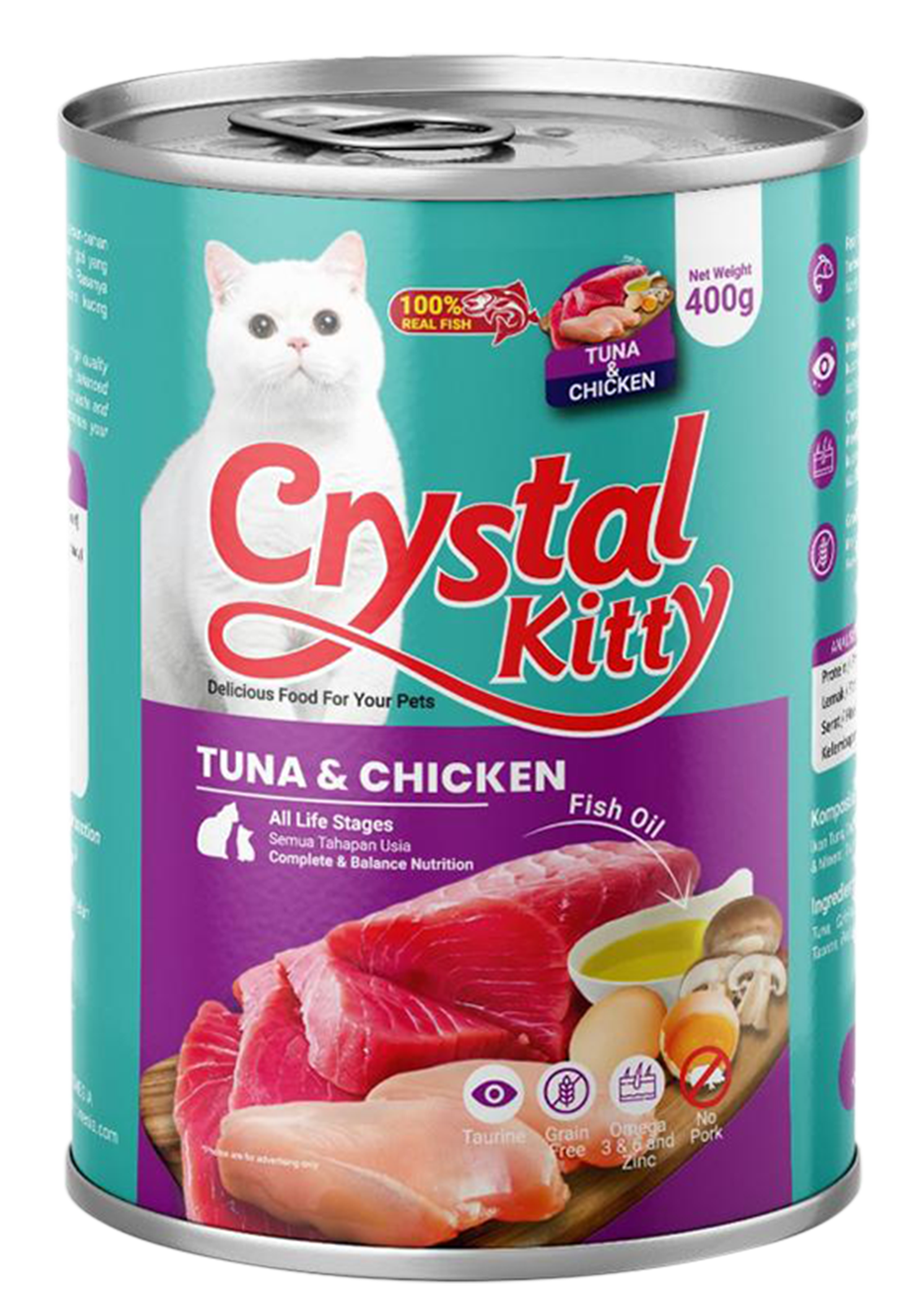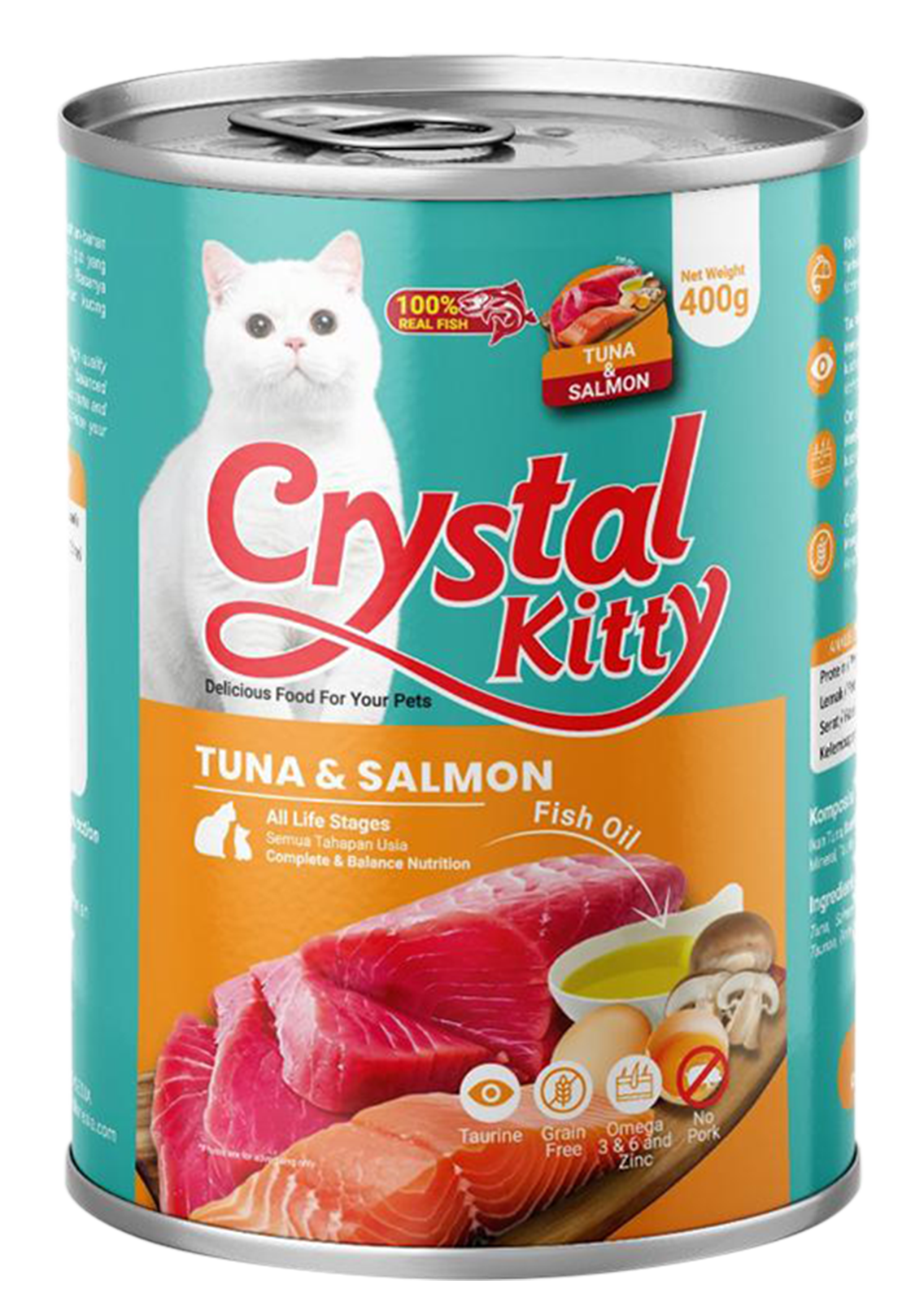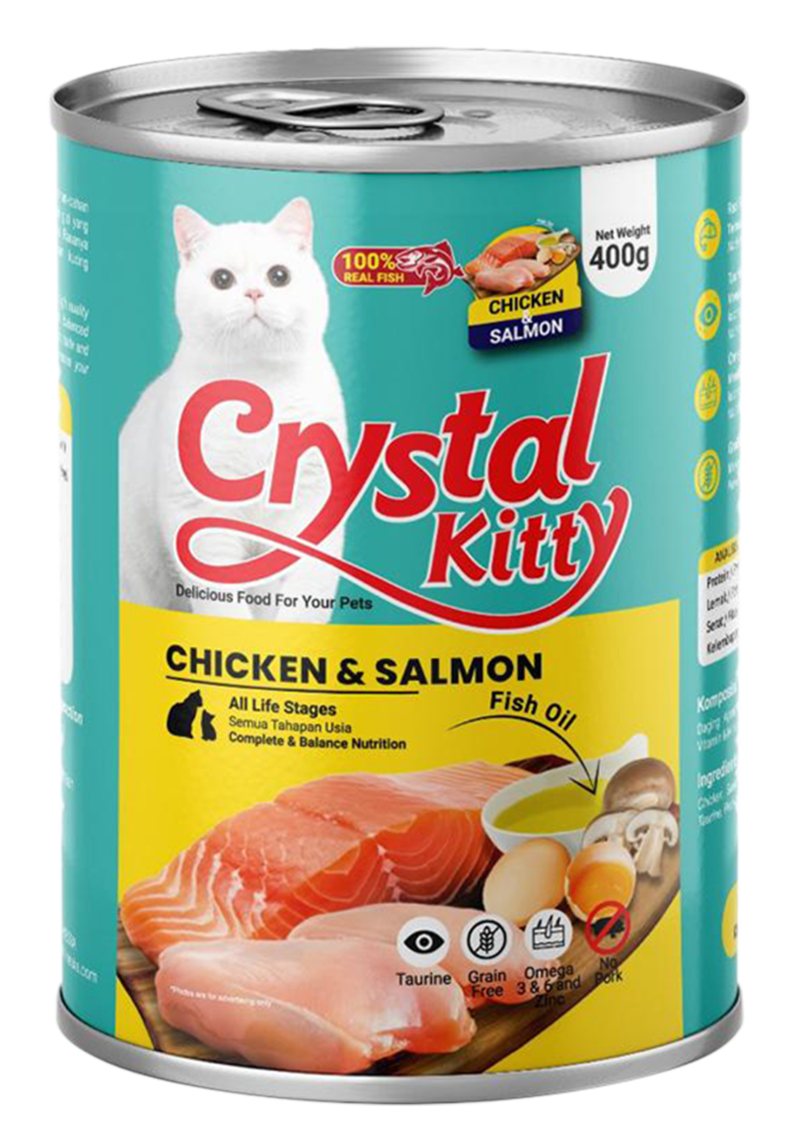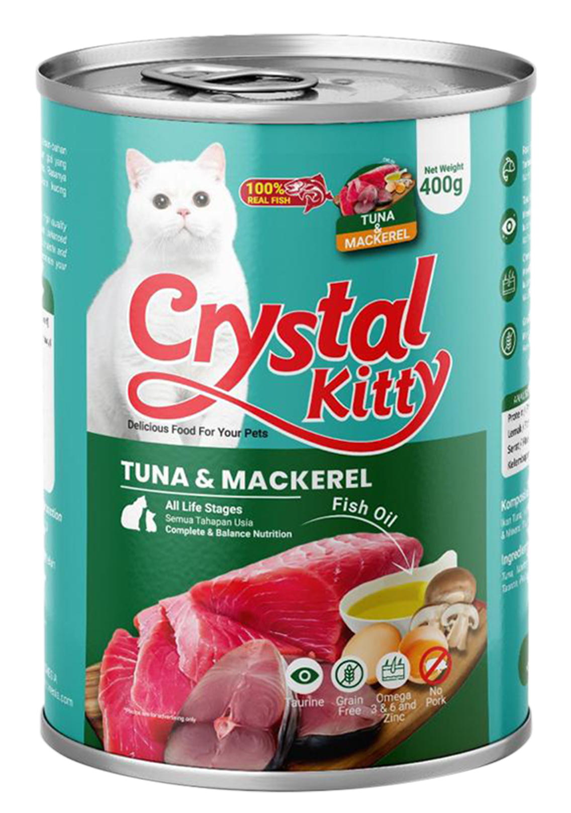 Crystal Kitty Cat Food Canned dibuat dengan bahan-bahan berkualitas tinggi dan segar, nutrisi lengkap dan gizi yang seimbang untuk memenuhi kebutuhan kucingmu. Rasanya yang lezat dapat meningkatkan nafsu makan kucing kesayanganmu